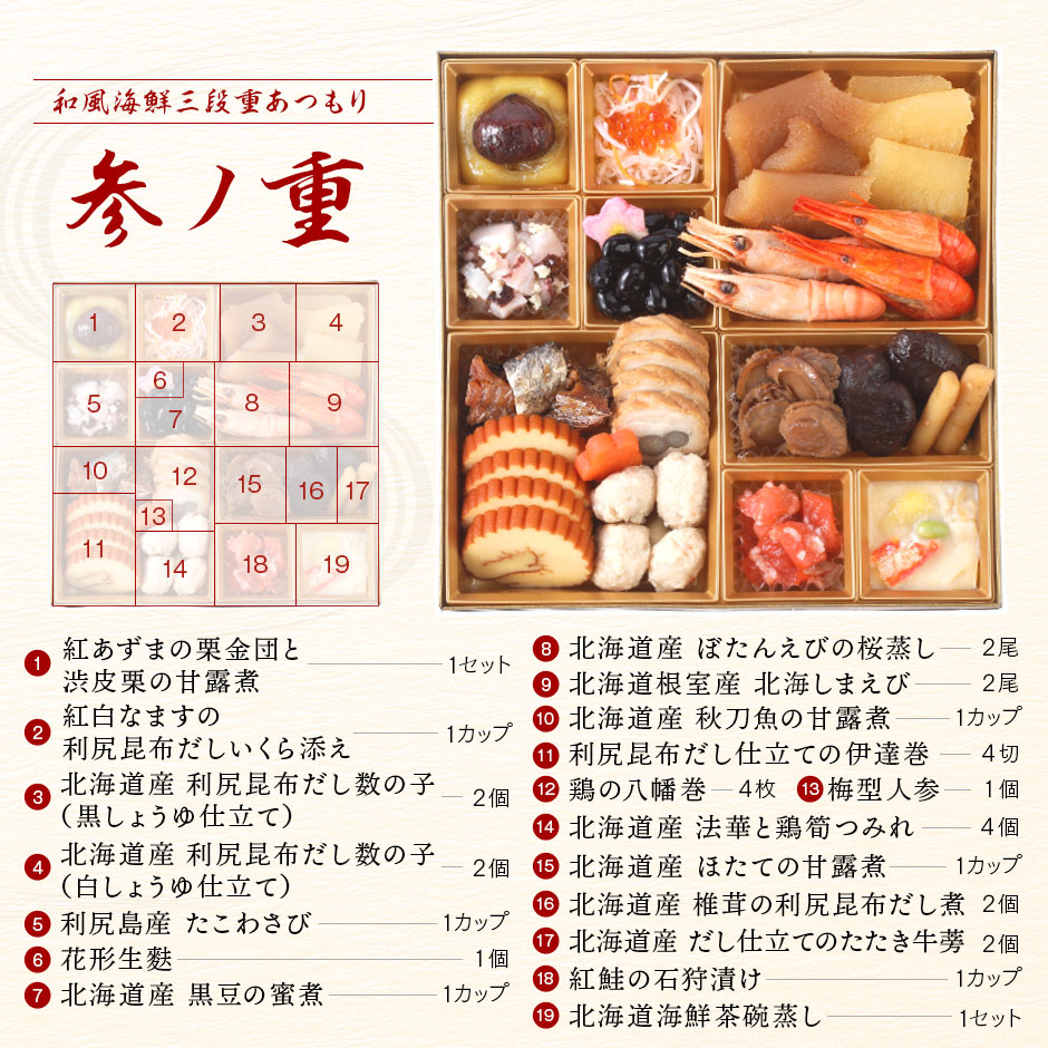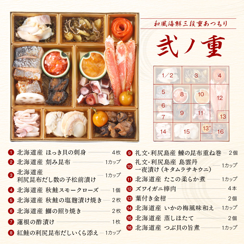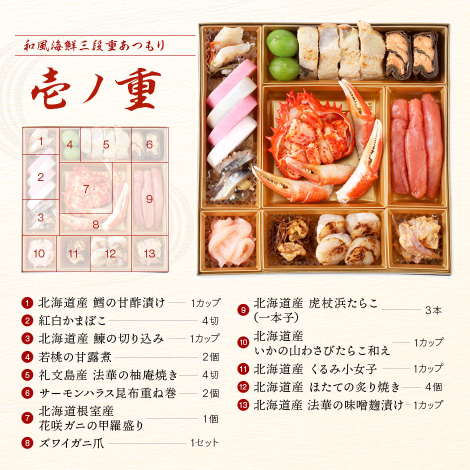 × 北海道の蟹入り高級海鮮おせち 4人前「あつもり」 メーカー: 楽天市場 ジャンル: 海鮮おせち 27,990円 商品の魅力・PRポイント 北海道の厳選海鮮を利用した和風おせち。北海道根室産の花咲蟹甲羅盛り、礼文・利尻島産の雲丹一夜漬けなどが楽しめる。北海道礼文島の島の人。📋 商品詳細 🏭メーカー楽天市場 🎯ジャンル海鮮おせち 👥対象人数3〜4人前 📦段数三段重 🍱種別和風 🚚配送タイプ冷凍北海道の蟹入り高級海鮮おせち 4人前「あつもり」 お品書き・内容● 商品内容:特大8寸三段重● 品数:全48品目● 原材料:同封の一括表示情報に商品ごと記載● 別添品:お雑煮だしパウチ 40ml×2袋27,990円(税込)購入はこちら楽天市場で購入Amazonで購入🛒 ご注文・詳細確認 27,990円 楽天市場で購入 Amazonで購入 ※価格は通常価格です。 ← 前のページに戻る
